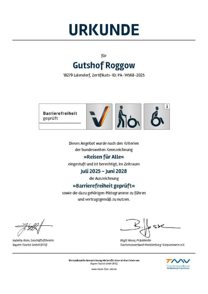Wir freuen uns sehr, dass der Gutshof Roggow offiziell mit dem bundesweiten Zertifikat „Reisen für Alle – Barrierefreiheit geprüft“ ausgezeichnet wurde. Die Urkunde ist bis Juni 2028 gültig und bestätigt, dass unsere Ferienwohnungen nun nachweislich rollstuhlgerecht und für Menschen mit Gehbehinderung geeignet sind.